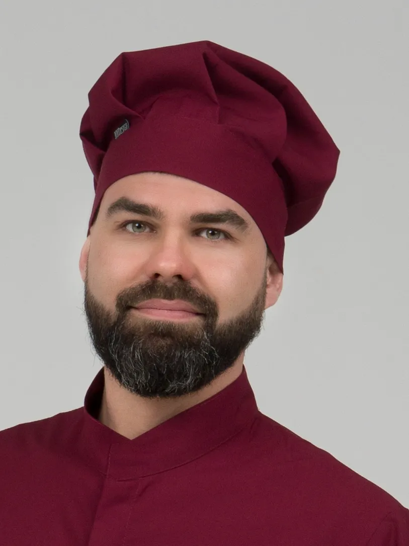 Колпак повара кондитера красивого бордового, винного цвета. Колпак можно подобрать в цвет фартука или кителя - белый, черный, шоколад, смотрите в товара NVDesign. Колпак повара с широкой декоративной полосой по голове.