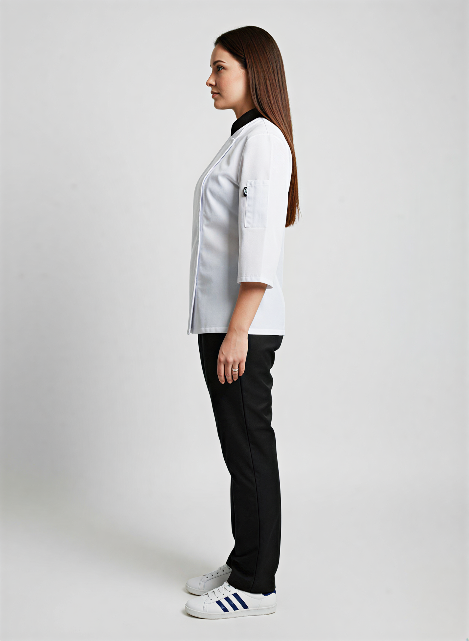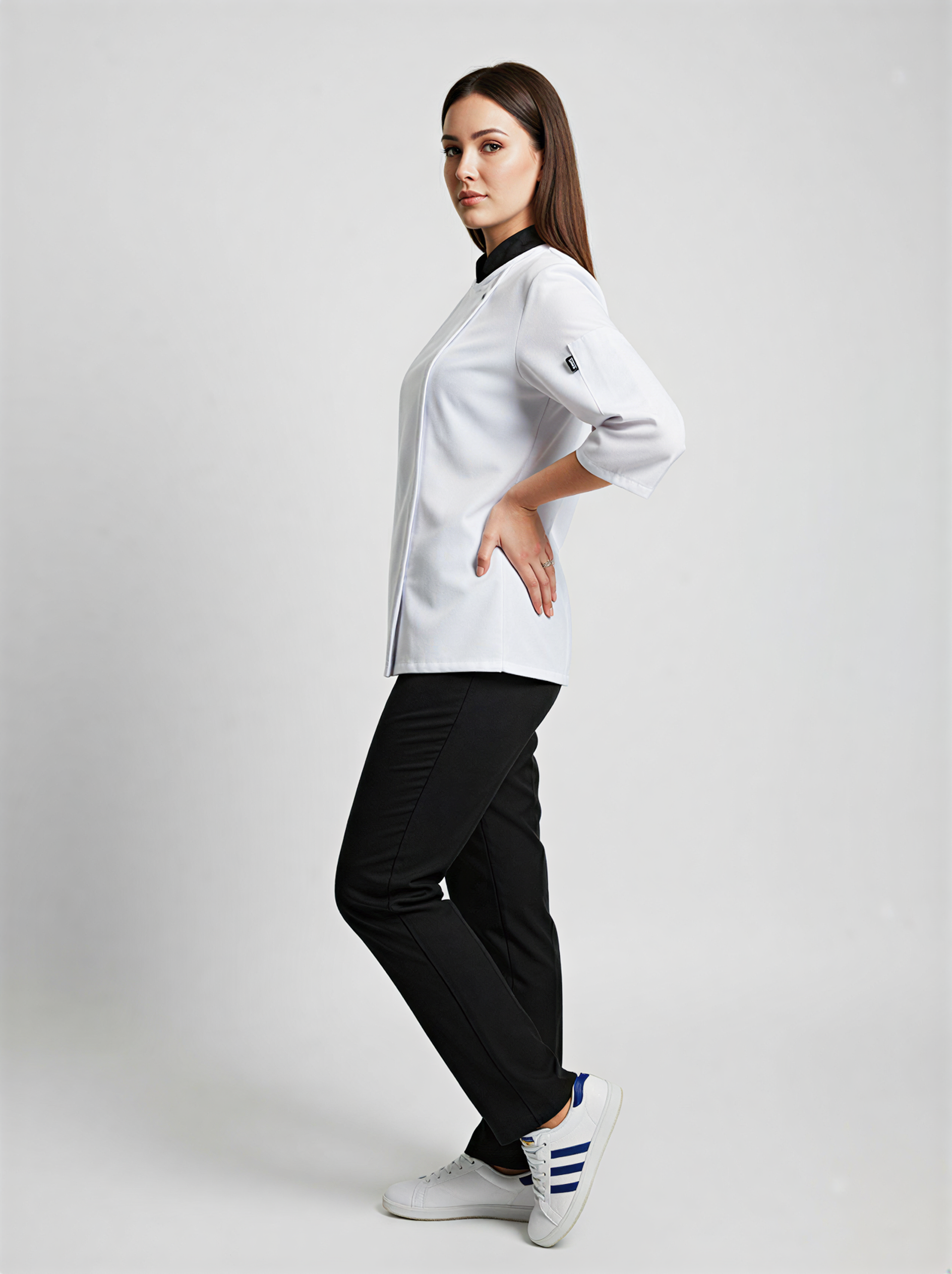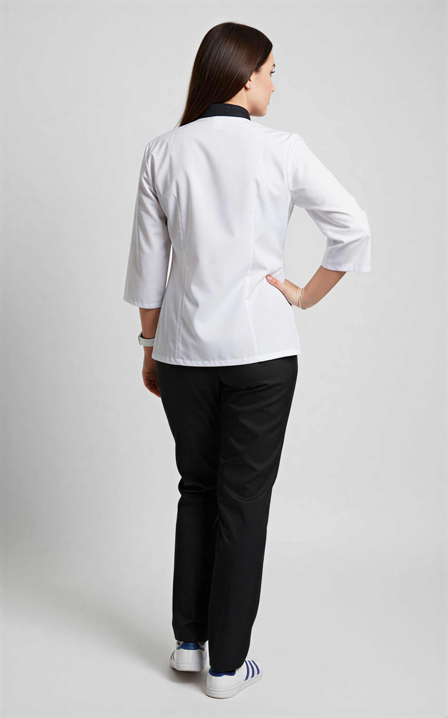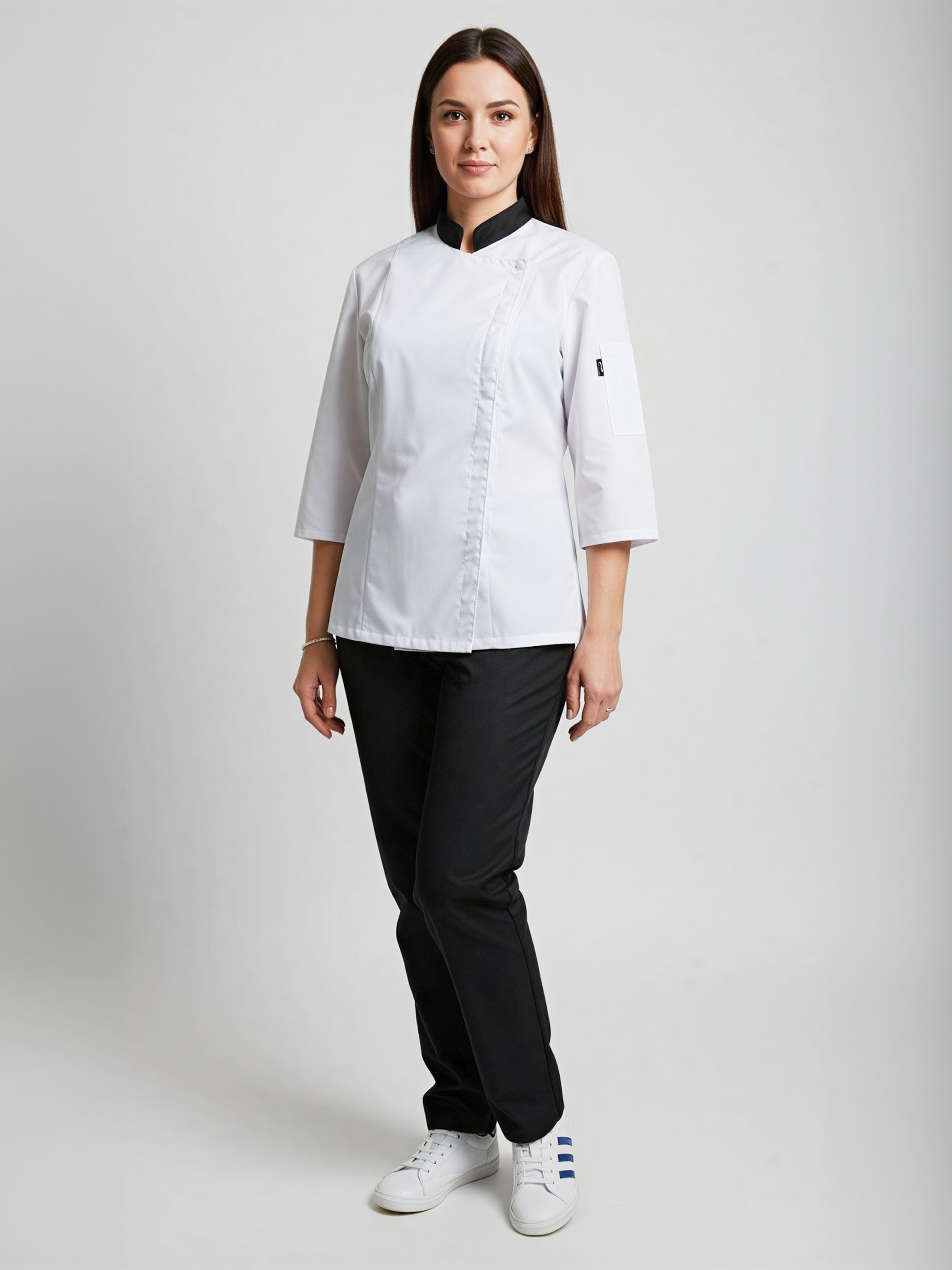Костюм повара женский состоит из Белого кителя и черных брюк.