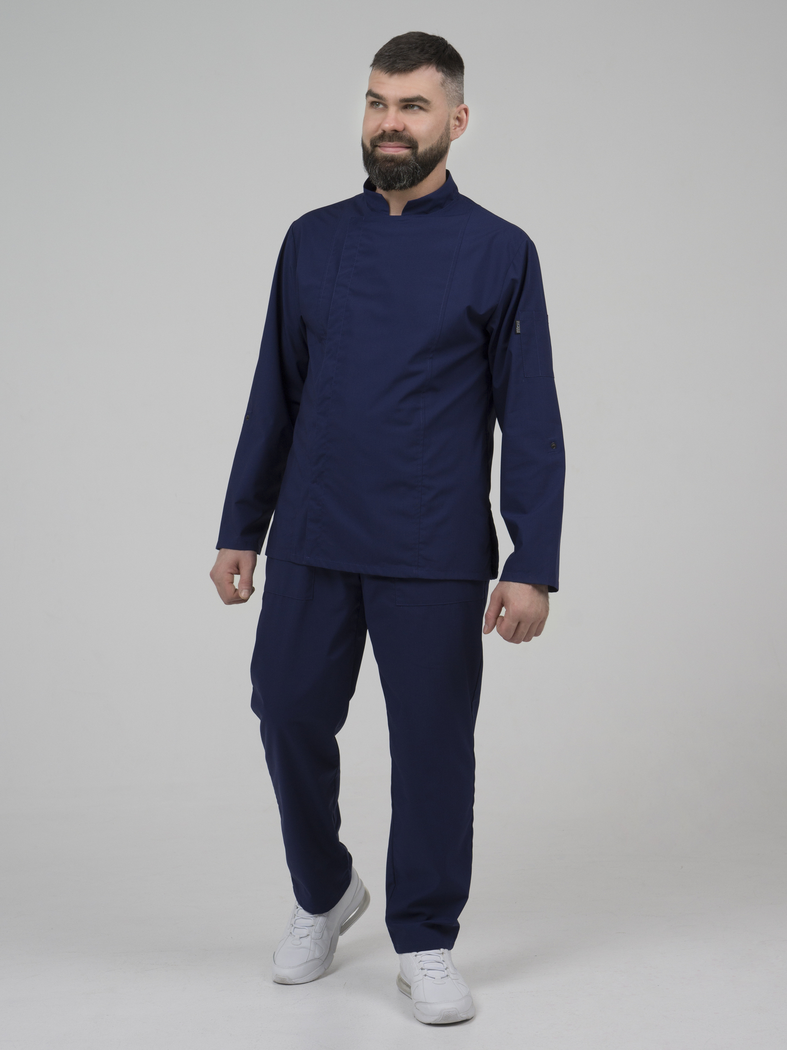 темно-синий мужской китель «NVDesign» – идеальный выбор для презентабельного внешнего вида и комфортной работы! Элегантный дизайн с длинным рукавом, который легко трансформируется в рукав 3/4 с помощью хлястика, а также потайная застежка на кнопках. Небольшой карман на рукаве для ложек.