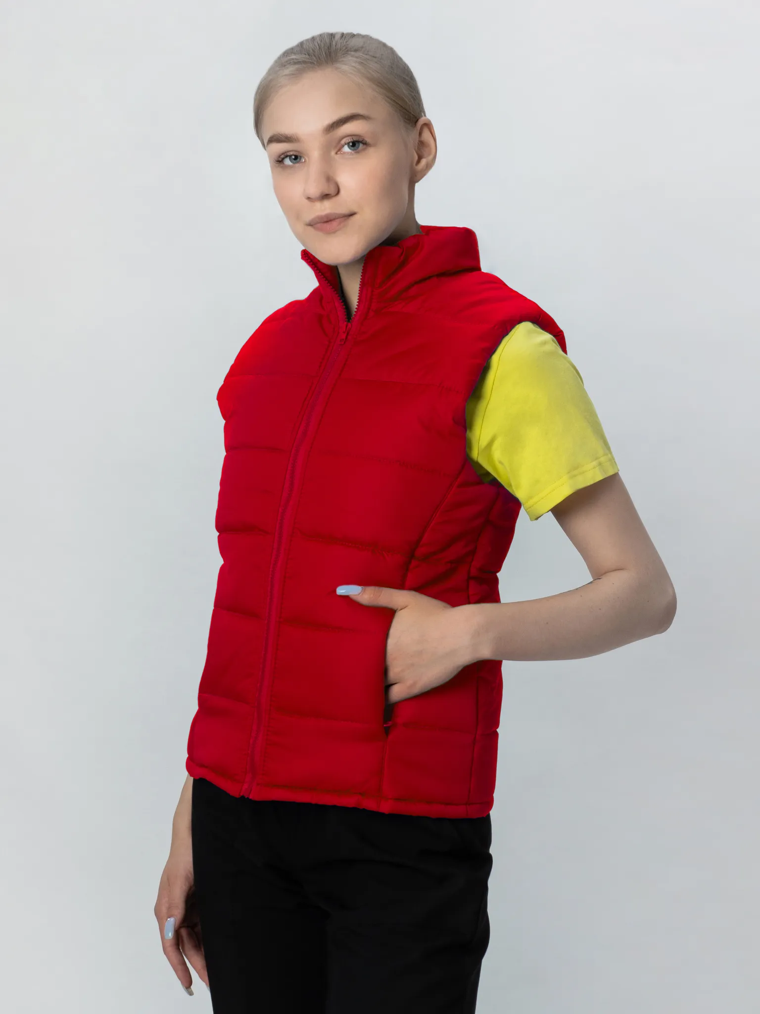 Предлагаем женские и мужские утепленные жилеты от производителя NVDesign. Модель имеет воротник-стойку, застежку на молнию, удобные боковые карманы на молнии. Наполнитель из синтепона плотностью 150 г/м² обеспечивает теплоизоляцию.